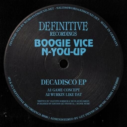Vinyl release of Boogie Vice & N-you-up - Decadisco. Released through Definitive and available on 12in.