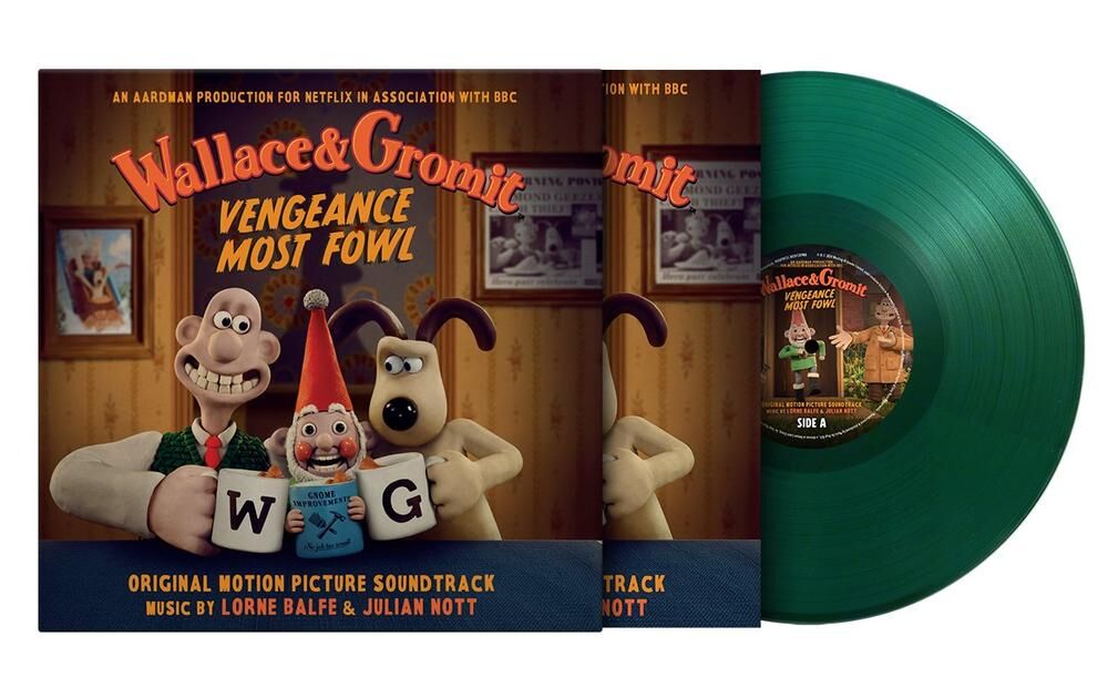 Wallace & Gromit: Vengeance Most Fowl is available as a limited edition of 500 numbered copies on Norbot green coloured vinyl and includes a 4-page booklet with an exclusive drawing by director and creator Nick Park.