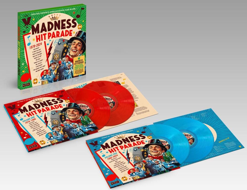 Vinyl release of Madness - Hit Parade: 1979 - 2024 (Limited Red & Blue Translucent Coloured Vinyl). Released through West Village Music Management Ltd and available on 4LP.